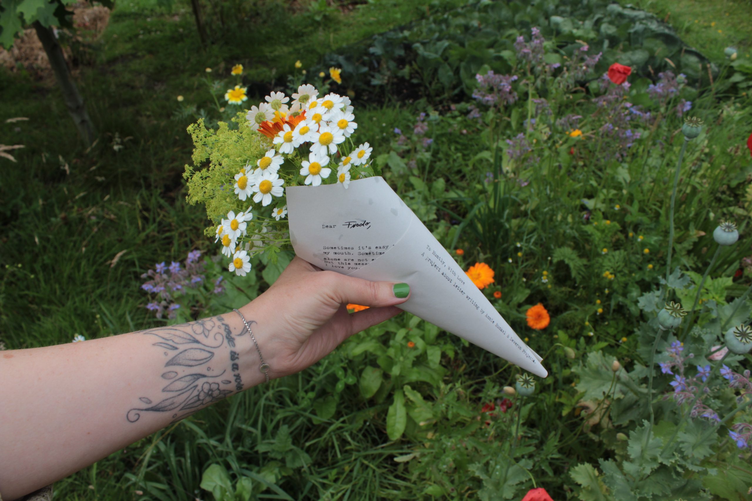 For August's Farmers' Market, we were joined by our current artist in residence Annie Runkel, who was in Huntly working on her project To Huntly, With Love. Looking at paces of communication and how communities engage with each other, Annie delved into letter writing, and at this August market, we were providing a letter postal service with a difference – a selection of flower bouquets, each wrapped in a letter with a greeting of your choice.