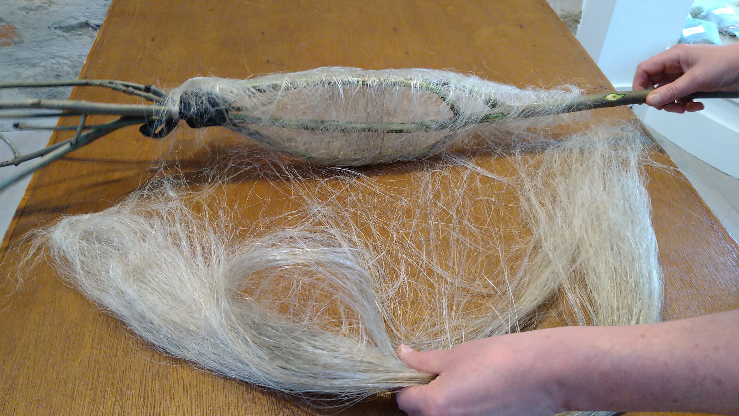 13.30 – 15.30: Cath Snape (with input from Christine Borland, Daisy Williamson and Lynne Hocking-Mennie) Distaff Dressing & Flax spinning workshop
