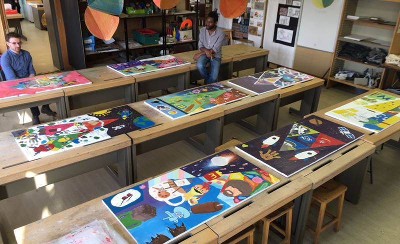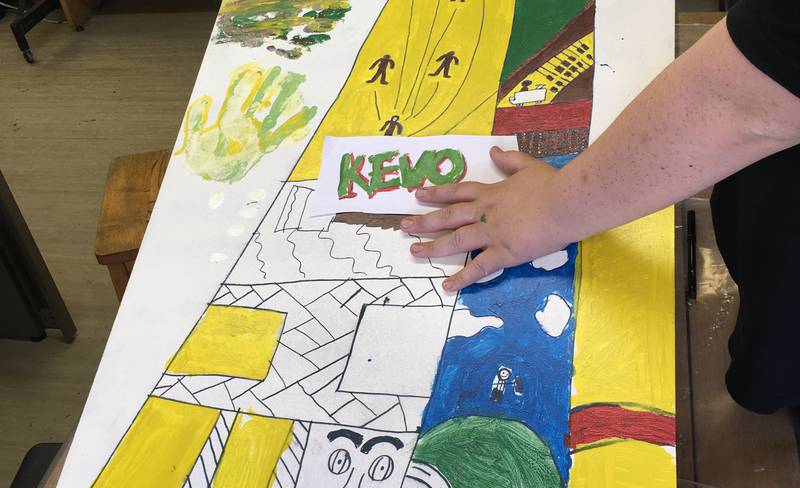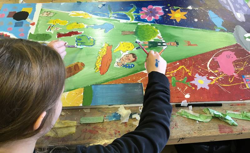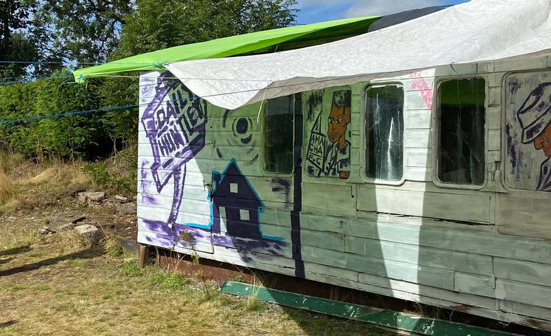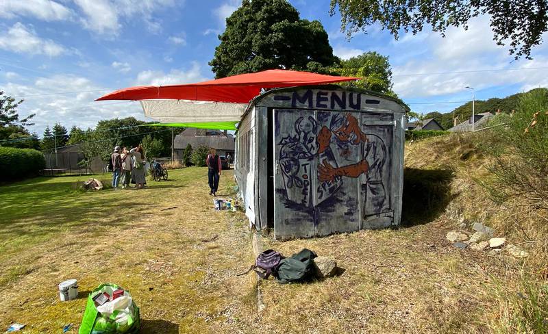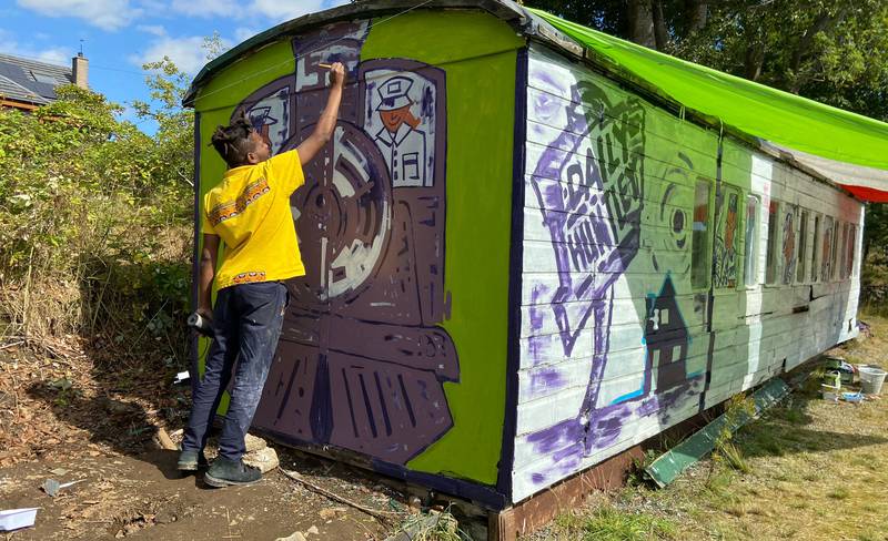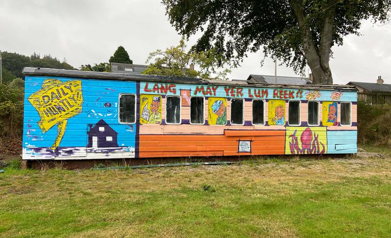 To find answers to these questions, Kevo created new murals at three locations across the town: Gordon Rural Action's new Bikery workshop, The Gordon Schools and a train carriage in a garden next to the A96. Following a call out for mural locations, Kevo's mural at the Bikery – a community bike maintenance workshop – was inspired by the wheels, spokes, bike frames and handle bars surrounding him to create a mural of a cyclist taking a ride through the green hills of Huntly’s surroundings. On the edge of the A96, Kevo turned an old train carriage into a colourful welcome to Huntly, mixing lines from Robert Burns poems with his own style of painting and portraits of train travellers. Kevo also spent some time working with a group of pupils at The Gordon Schools to create a series of panels inspired by their present situations and future dreams. Kevo used tools made as part of Affirmative Art, a programme he co-designed in 2021 to empower people to draw, discuss and discover their dream future. The final painted panels feature planes, mugs of tea, NASA, portraits, sausage rolls, calculators, cartoons, books, pigs, cameras, algebra and alien spaceships… amongst many other things, and are installed in locations chosen by the pupils for the whole school to admire.
